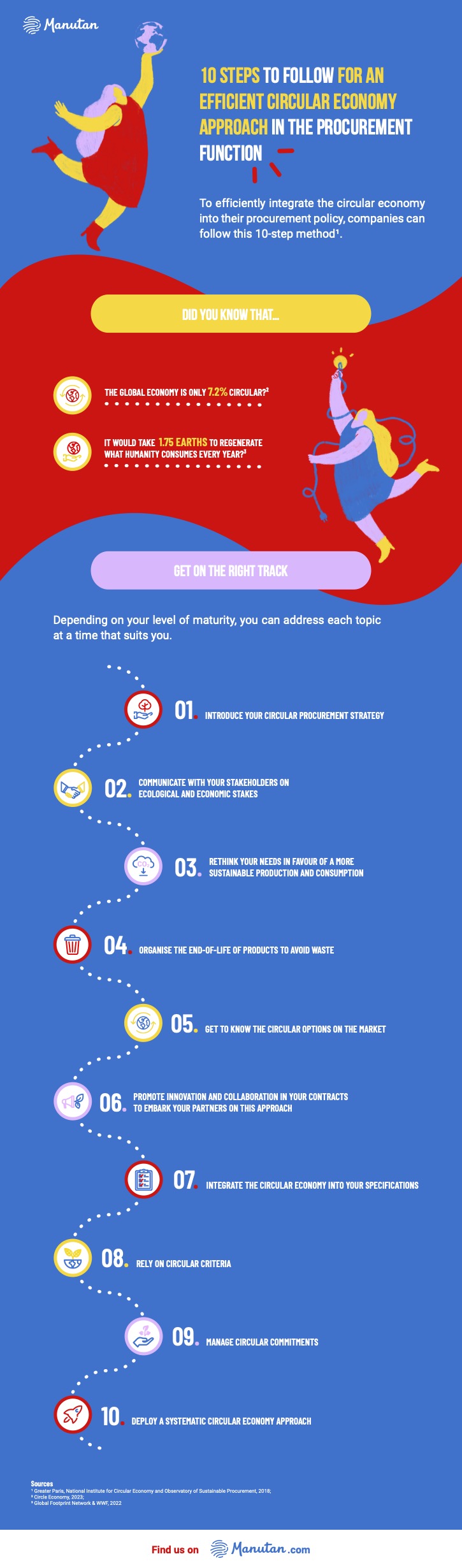 For several years, a collective awareness has been growing in favour of the circular economy system. The goal: To dissociate economic growth from the consumption of resources. This has become one of the key concerns of circular procurement, with the idea of making "smart savings" and promoting sustainable development. To integrate this new economic model into their procurement policy, companies can follow 10 steps, inspired by an operational guide produced by circular economy experts[1]. This ranges from the launch of a dedicated strategy to the systematisation of this circular economy approach.