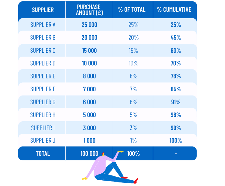 A company wishes to optimise its expenditures by identifying the suppliers that represent the major part of its purchases. It therefore collects the necessary data and classifies them in a table.