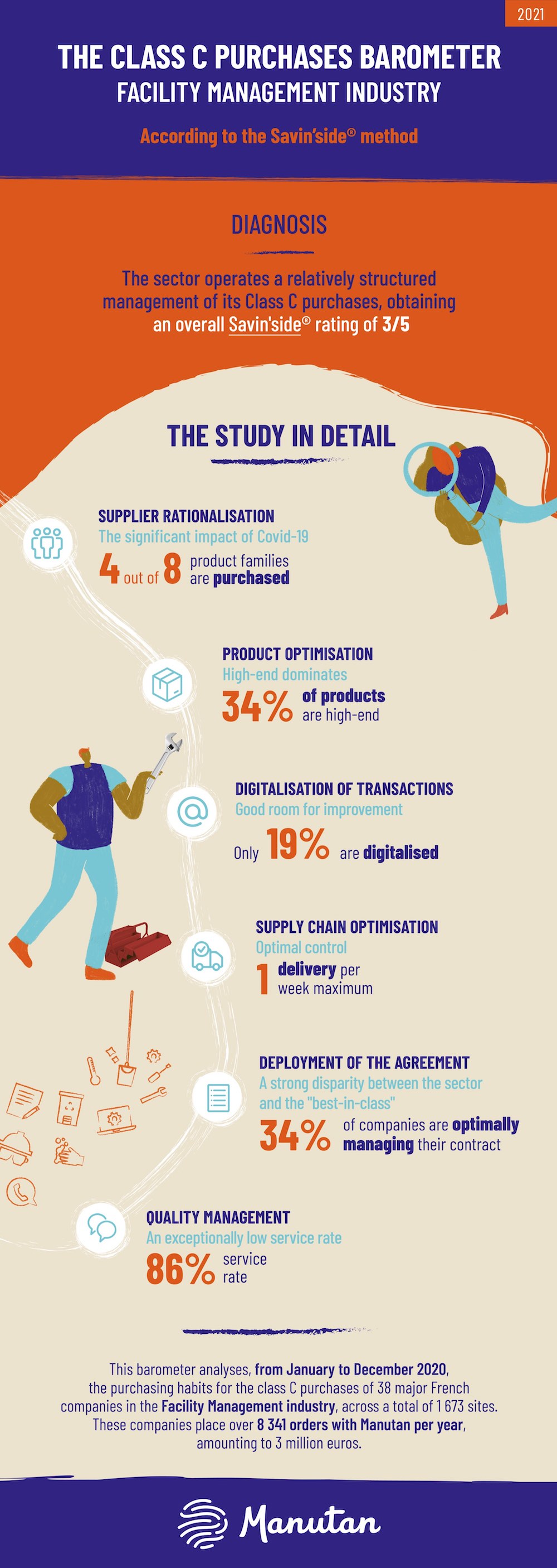Having analysed the management of tail spend in the construction, transport and storage industries, Manutan has carried out its latest barometer on facility management. Using the Savin'side® method, the purchasing habits of 38 major French companies have been scrutinised across six key areas. With an overall Savin'side® rating of 3/5, the sector shows good overall performance. However, despite performing well in terms of logistics, further improvements still need to be made in two major areas: supplier portfolio streamlining and transaction digitisation.