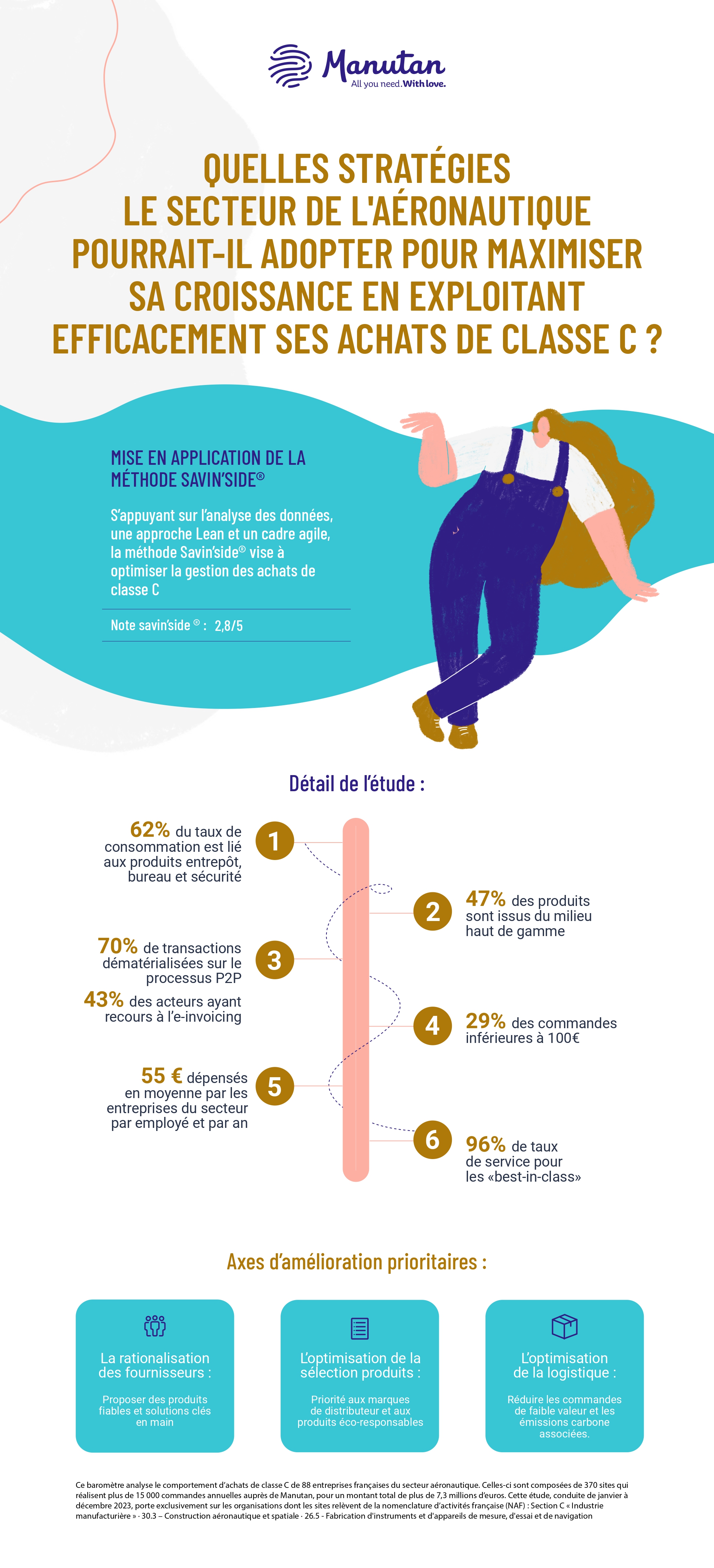 Le groupe Manutan a édité un nouveau baromètre des achats de classe C, dédié au secteur aéronautique. Nos experts ont analysé le comportement d’achats de près d’une centaine d’entreprises françaises, selon la méthodologie Savin’side®, dans le but d’évaluer leur niveau de maturité quant à leur gestion des achats de classe C. Cette étude met en lumière une performance contrastée, avec une note moyenne de 2,8/5. Découvrez les enjeux et les opportunités de la filière pour soutenir sa croissance.