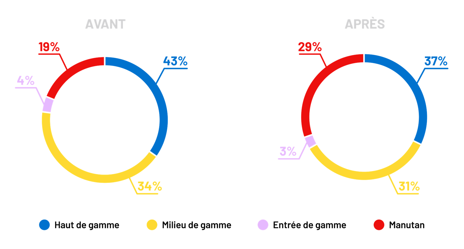 L’entreprise a ainsi réduit sa consommation de haut de gamme (- 6 points), de milieu de gamme (- 3 points) et d’entrée de gamme (- 1 point) au profit de la marque de distributeur du fournisseur (+ 10 points). Parce que celle-ci présente un très bon rapport qualité/prix, la société a réduit ses coûts directs de 33 524 € la première année.