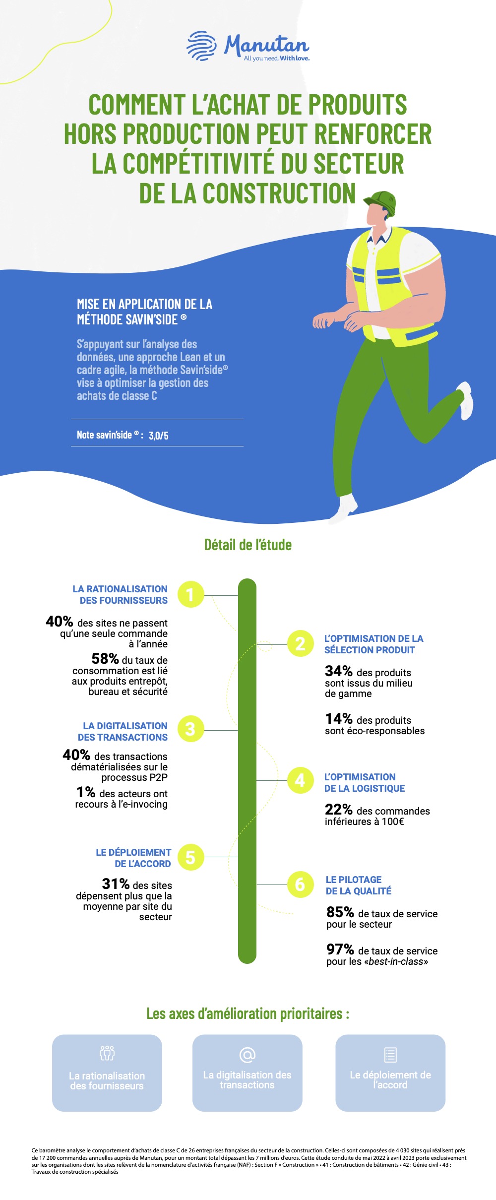 Pour accompagner ces entreprises dans leurs réflexions stratégiques, le groupe Manutan a publié son dernier baromètre sectoriel des achats de classe C, en s’appuyant sur la méthodologie Savin’side®. À travers l’analyse du comportement d’achats de 26 entreprises françaises, nos experts ont évalué leur maturité en matière de gestion des achats de classe C. Découvrez en infographie les grandes tendances qui ressortent de cette étude.