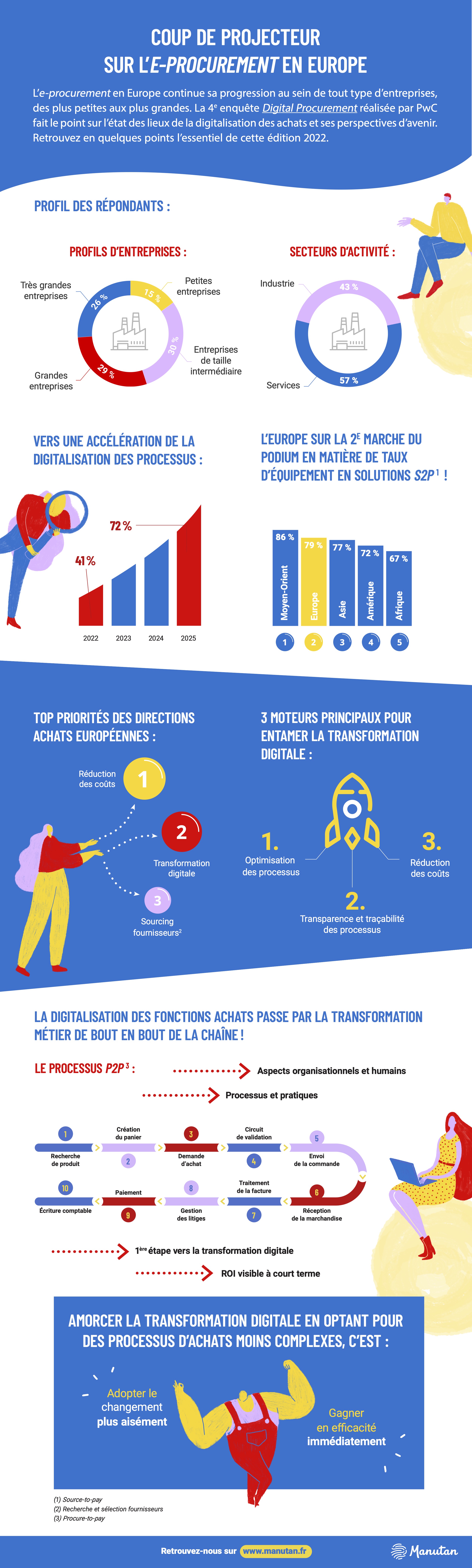 La vague de la révolution technologique emmène avec elle les entreprises qui se digitalisent de plus en plus. La fonction achats n’y fait pas défaut. L’e-procurement en Europe ne cesse de croître, comme le confirme la quatrième enquête Digital Procurement réalisée par PwC en 2022. Mais entrons plus en détail sur la situation de l’approvisionnement en ligne. Quelle est la place de la digitalisation des achats en Europe ? Quelles sont les perspectives pour les années à venir ? Et quelles sont les priorités relatives à la digitalisation des achats ?