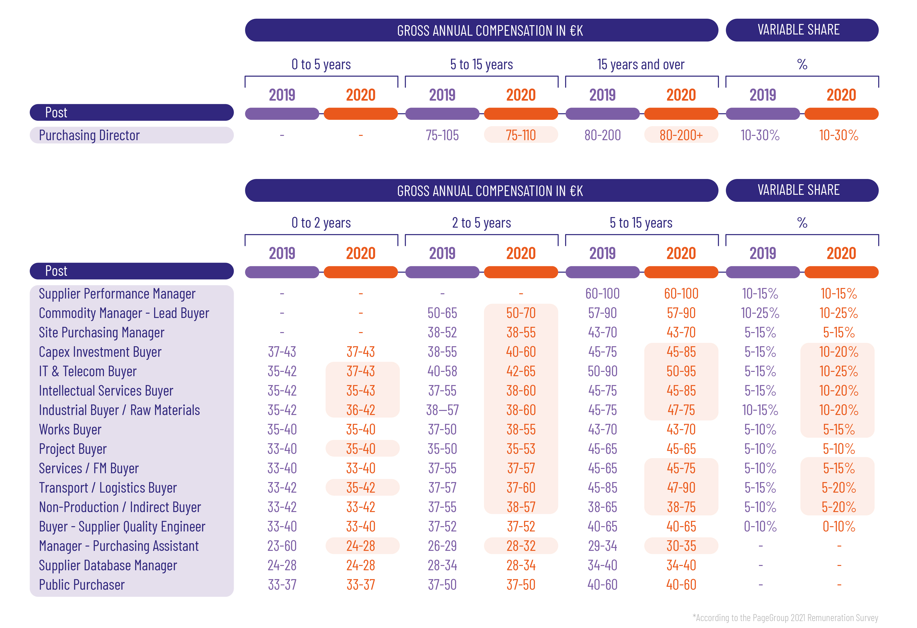 If you look more closely, there is a strong increase for Capex (capital expenditure) buyers, intellectual service buyers, service/facility management buyers and non-production/indirect buyers. In these four occupations, annual salary has increased by €10,000 for employees who have held their jobs for between 5 and 15 years. This allows them to earn gross annual pay of up to €75K or even €85K, not to mention the variable pay that's also increasing.